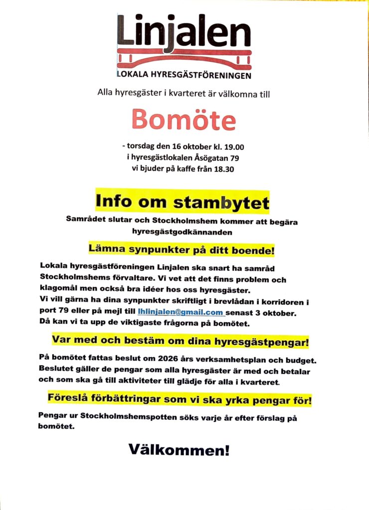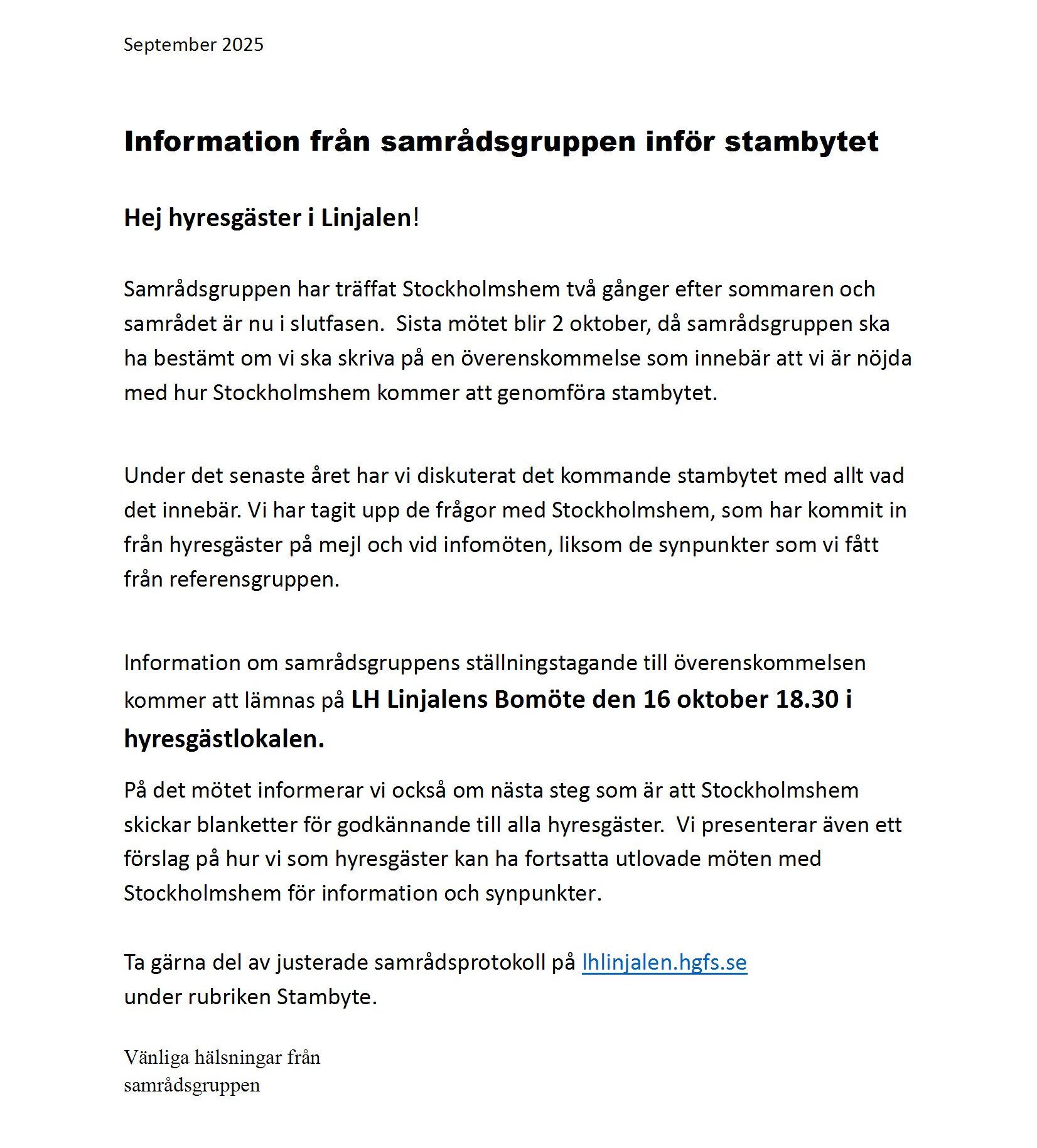 I fortsättningen kommer nyheter från föreningen och stambytesgruppen publiceras på hemsidan samt på portarnas anslagstavlor.